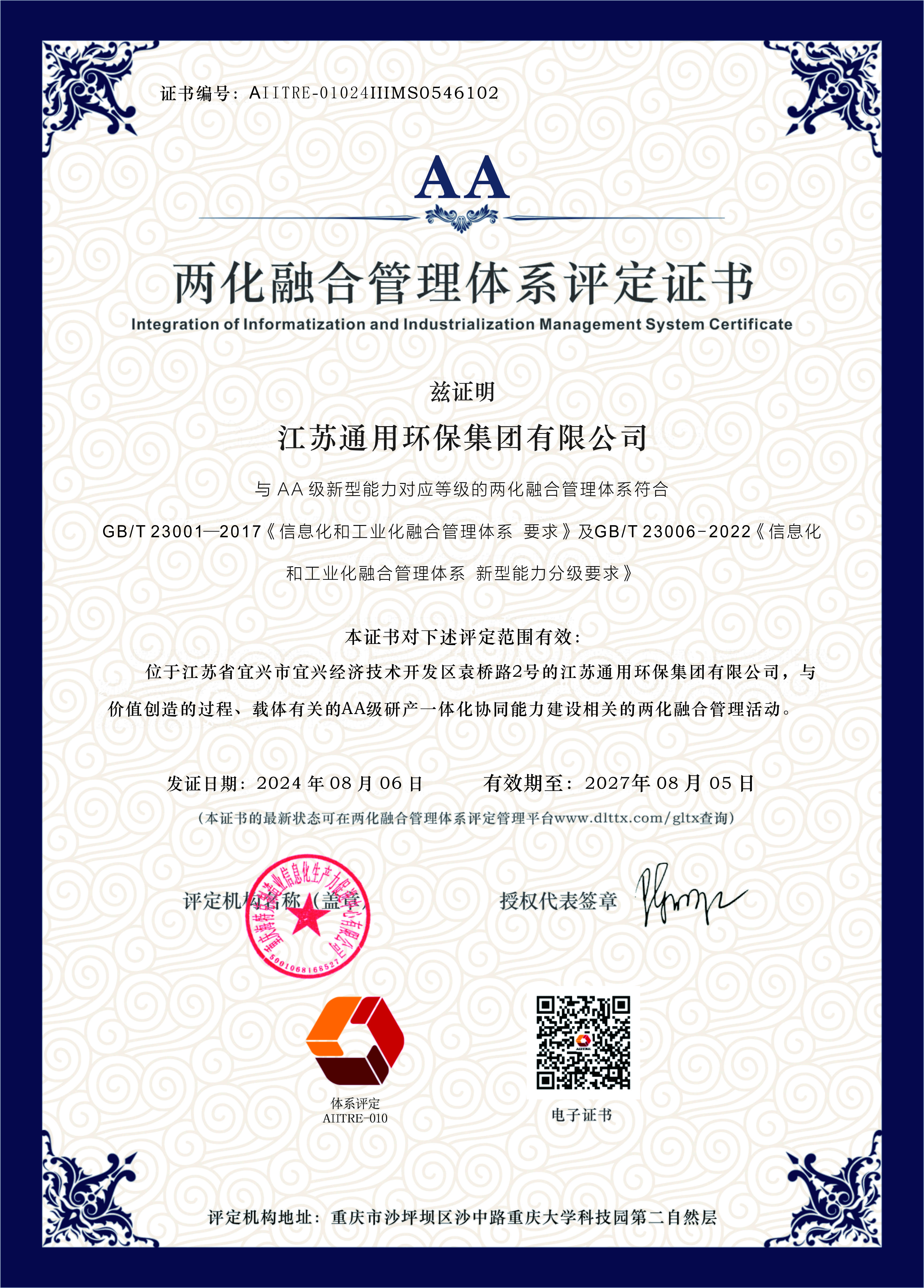 两化融合管理体系评定证书AA