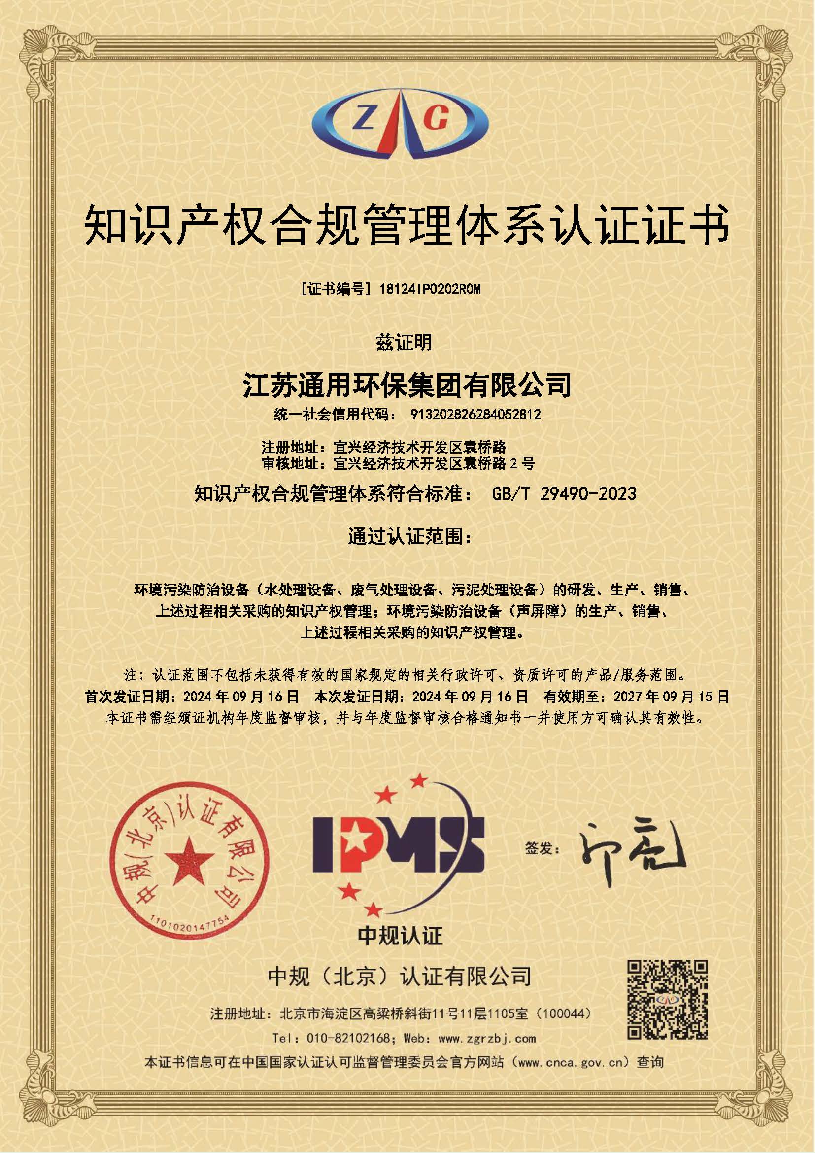 知识产权合规管理体系认证证书