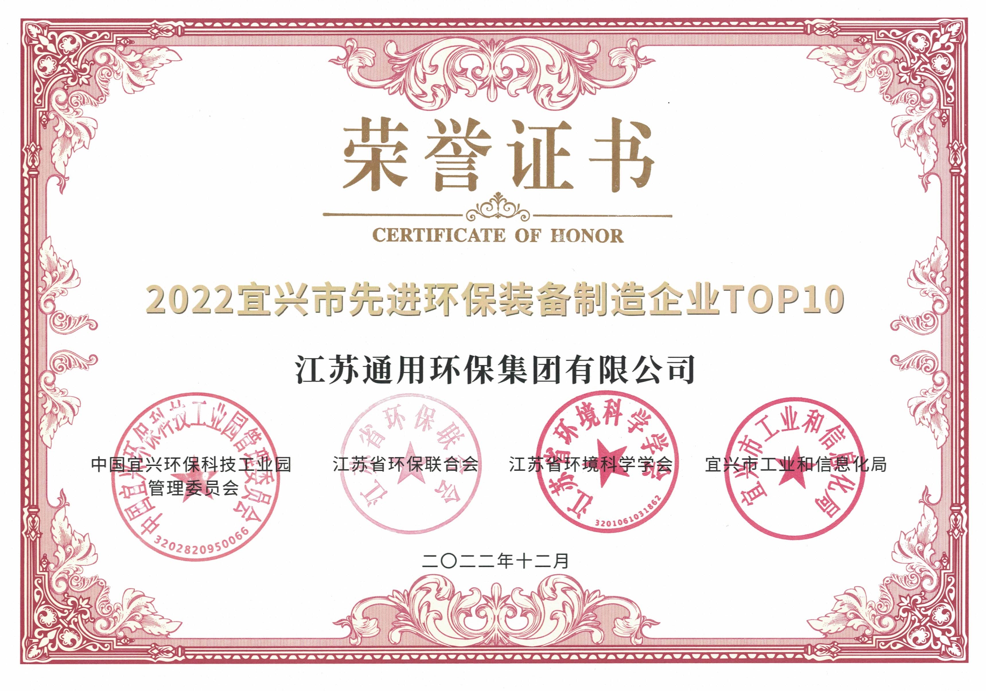 2022宜兴市先进环保装备制造企业荣誉证书