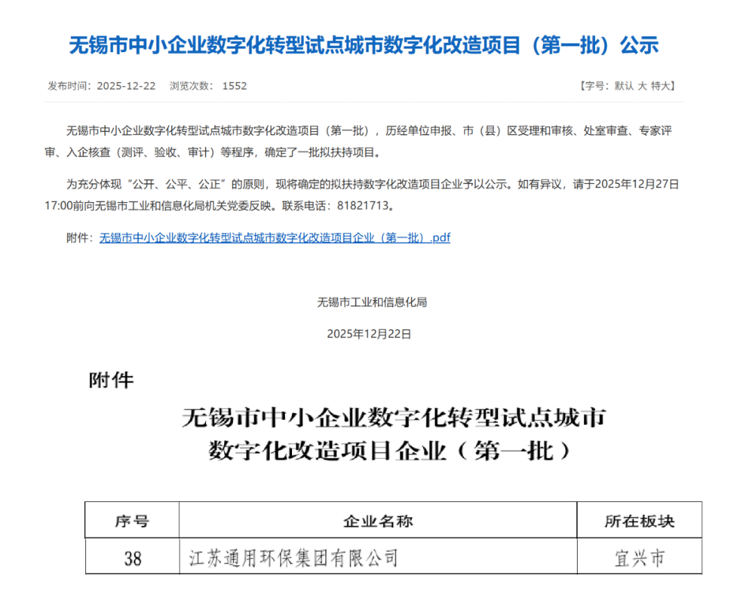 再添新誉!江苏通用环保集团成功入选无锡市中小企业数字化转型试点城市数字化改造项目(第一批)