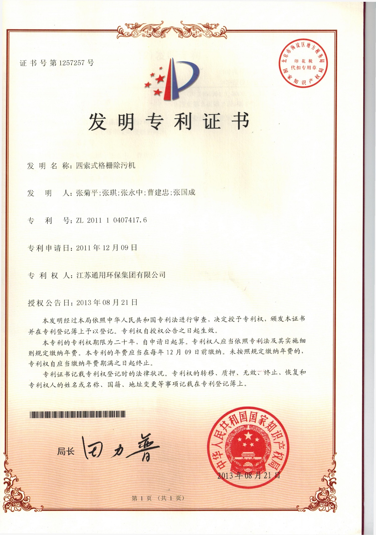 四索式格栅除污机发明专利证书2013.8.21