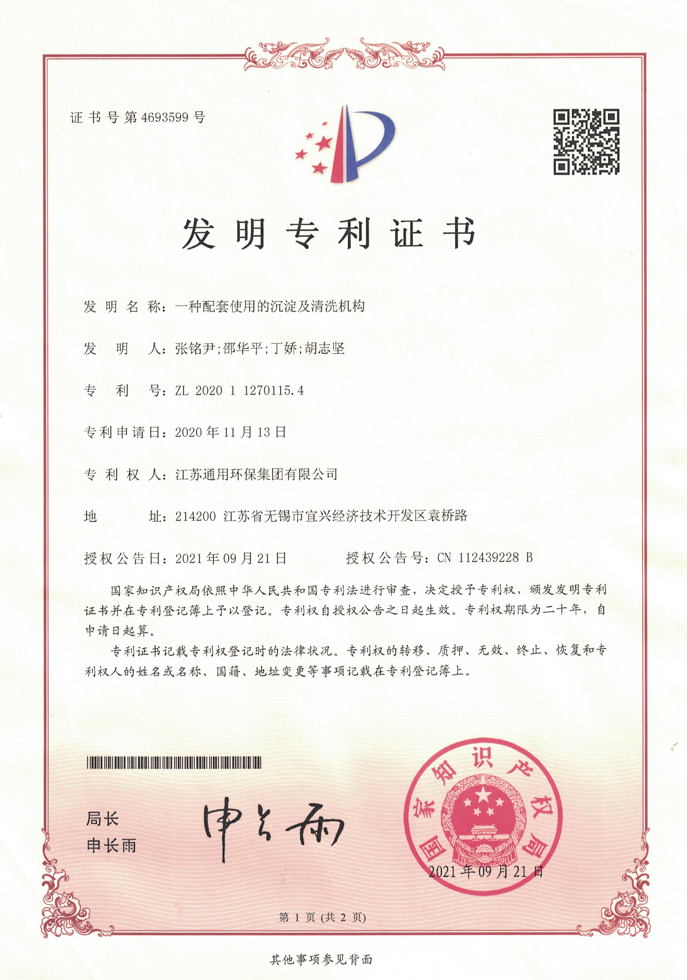 一种配套使用的沉淀及清洗机构发明专利证书2021.9.21