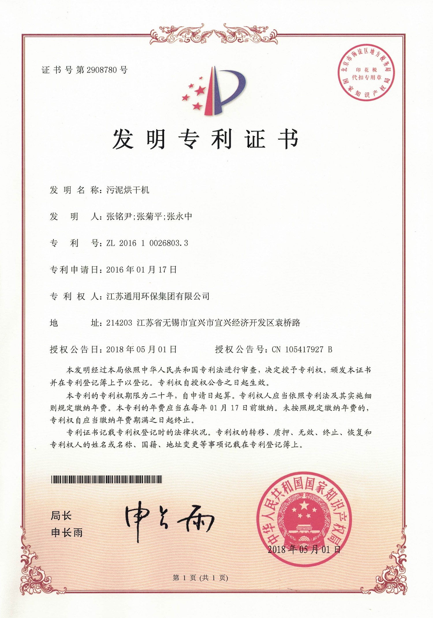 污泥烘干机发明专利证书2018.5.1