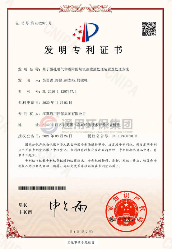 一种医疗废水处理工艺发明专利证书