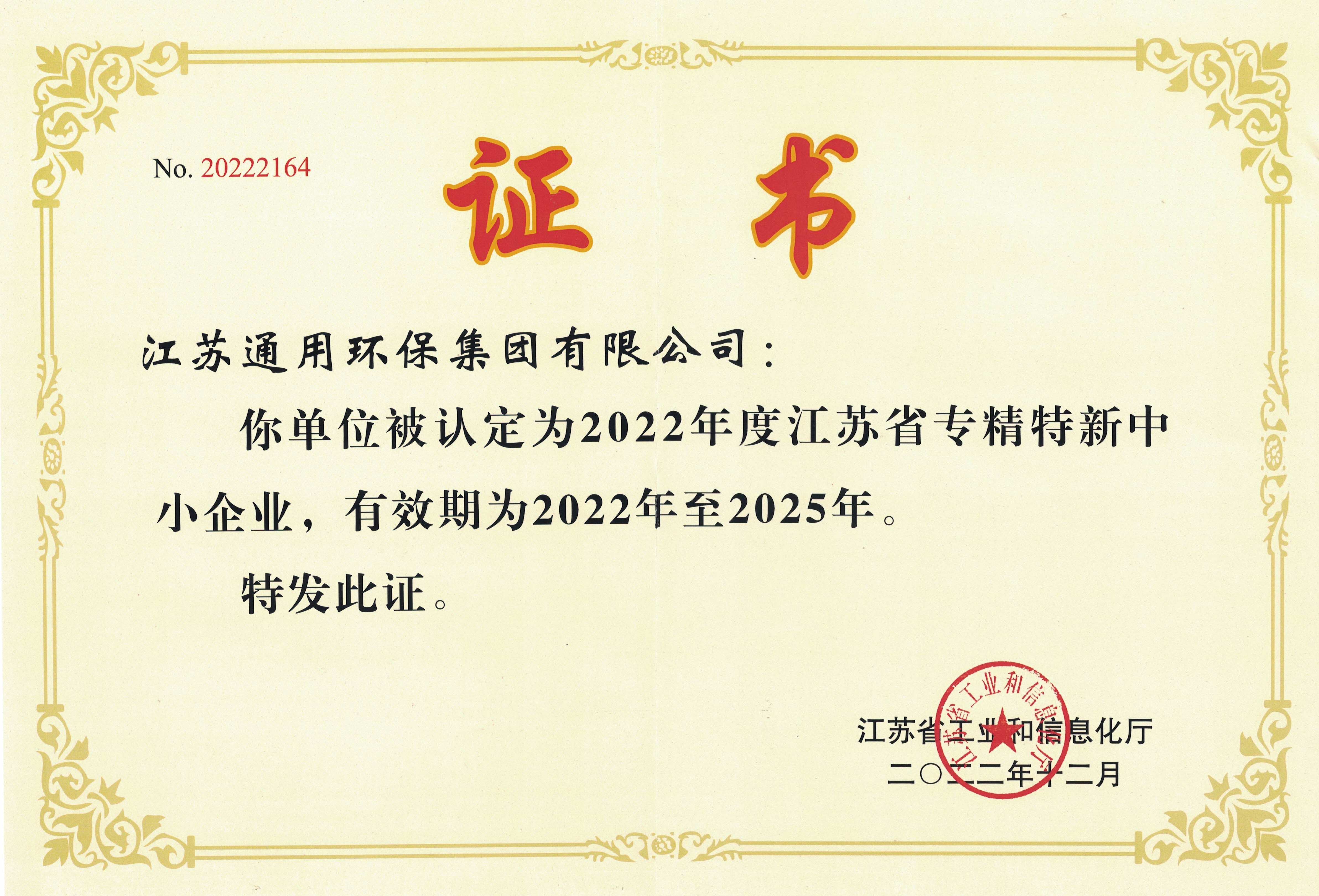 江苏省专精特新中小企业证书