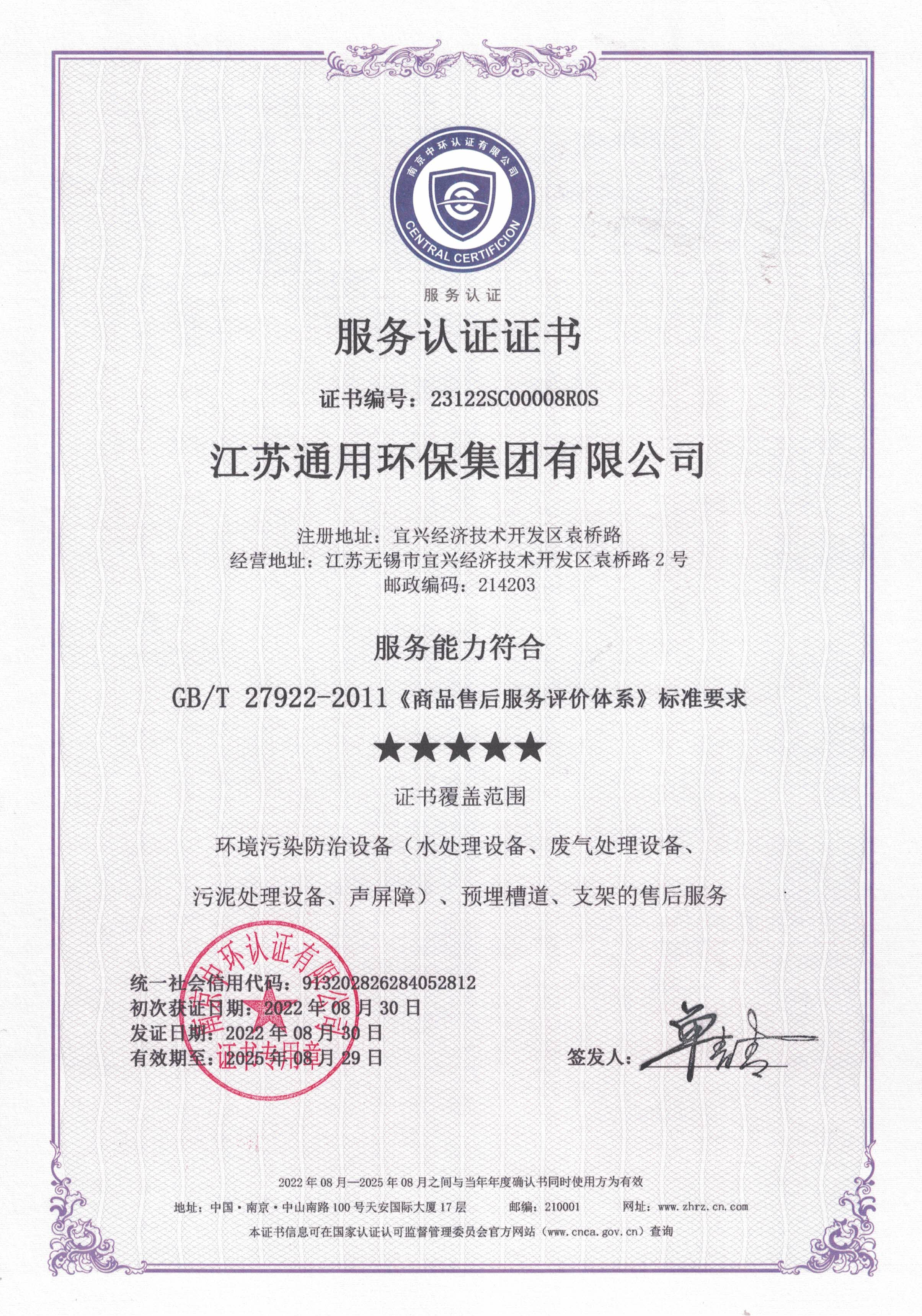 五星售后服务认证证书
