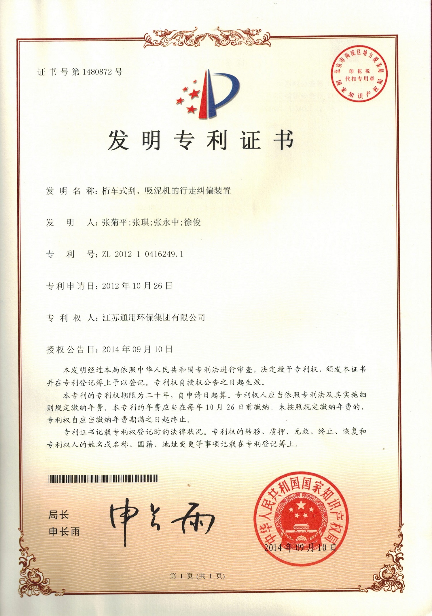 桁车式刮吸泥机的行走纠偏装置发明专利证书2014.9.10