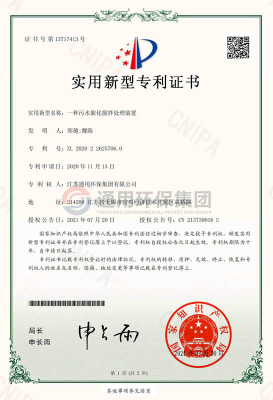一种医疗废水处理工艺发明专利证书